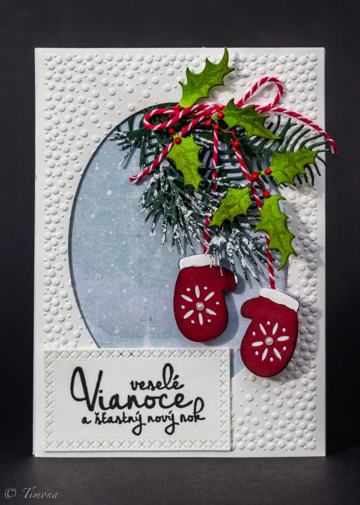 Rukavička (jedna) bola súčasťou vyrezávacích šablón, ktoré primárne predstavovali perníkové vianočné pečivo. Ja som však chcela urobiť rukavičky dve a nie perníkové. Najprv som sa musela popasovať s výrobou zrkadlovo obráteného výrezu, a potom už šlo všetko hladko a bez problémov. Zopár výrezov zasnežených vetvičiek ihličnanov som zviazala dokopy s vetvičkou cezmíny s červenými enamelovými „ďobkami“ a cez ne voľne prevesila rukavičky na šnúrke. Na biely základ pohľadnice som nalepila modrý dizajnový papier, naň biely, na ktorý som predtým vyrezala oválny otvor a následne embosovala pomocou embosovacej kapsy. Nakoniec som doplnila napečiatkovaný text.