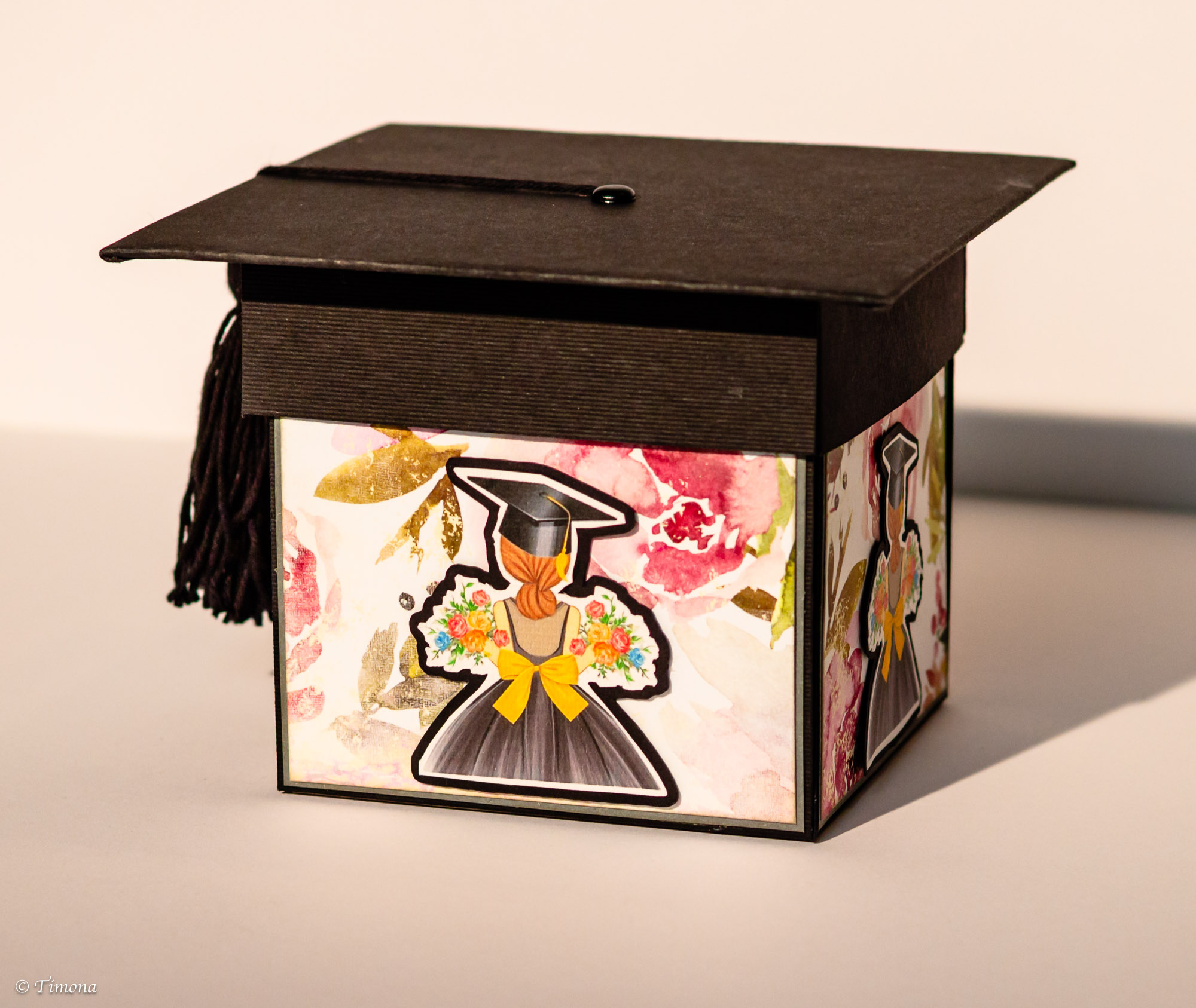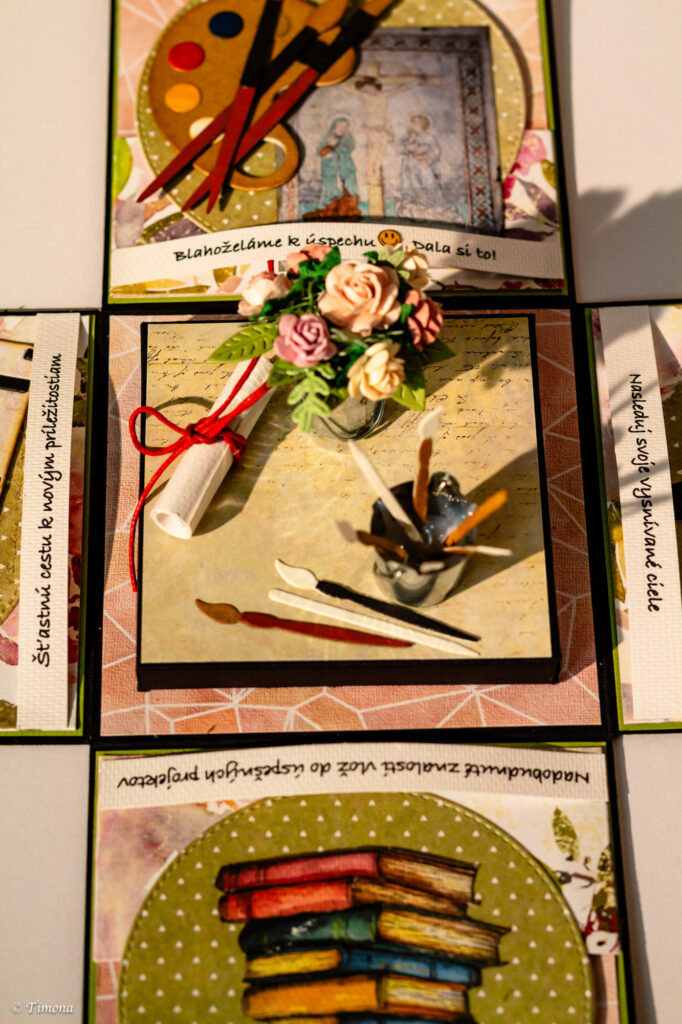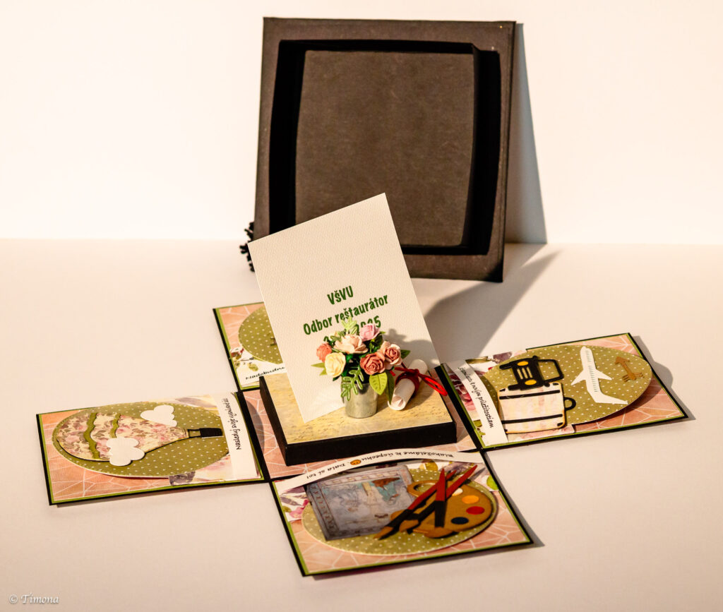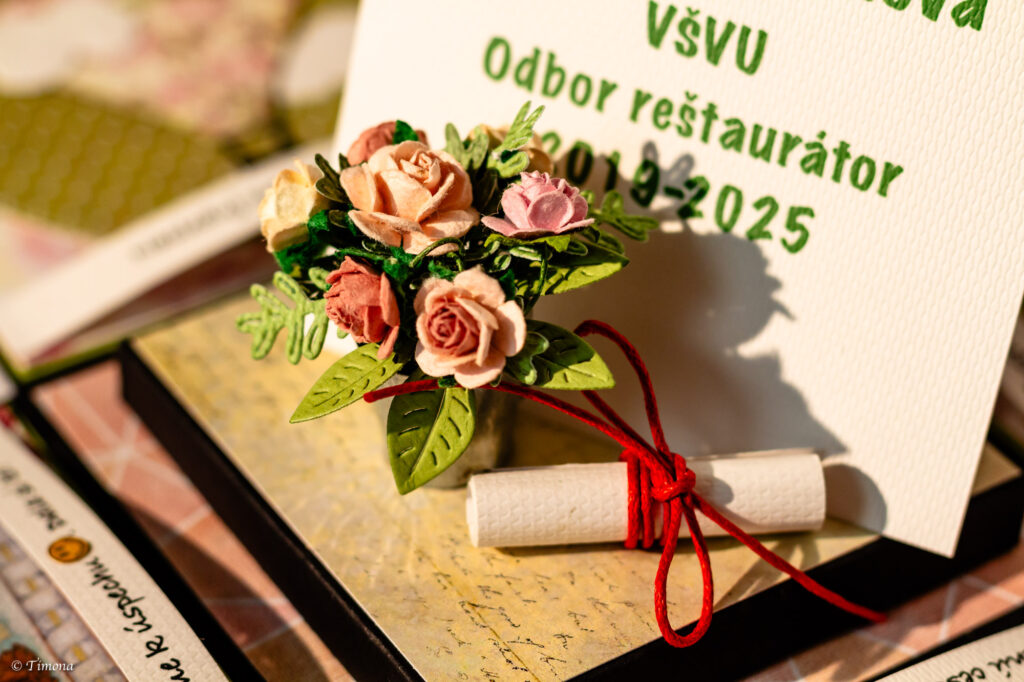 Krabičku s vrchnákom v podobe absolventského klobúka som už prezentovala niekoľko krát.  Každá z krabičiek je však svojim vnútorným obsahom iná. Tentoraz to bol darček pre reštaurátorku.