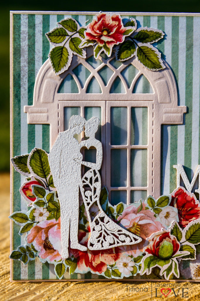 Pri príležitosti tejto svadby som hneď vedela, že gratulačnú svadobnú kartu vyrobím zo sady papierov Vintage Trip od Laserowe Love. Jednak preto, že svadba sa uskutoční práve v čase kvitnutia šípových ruží a jednak preto, že sa mi tie papiere páčia :-).