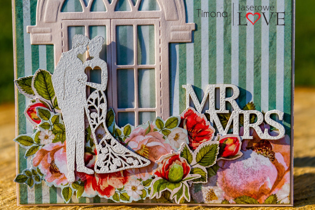 Okrem papierov som do výzdoby karty použila lepenkové výrezy, rovnako od Laserowe Love (postavičky a nápis Mr&Mrs).