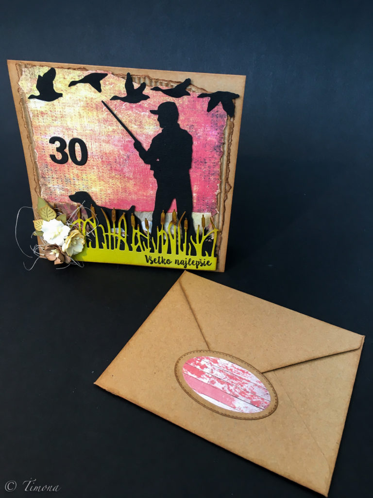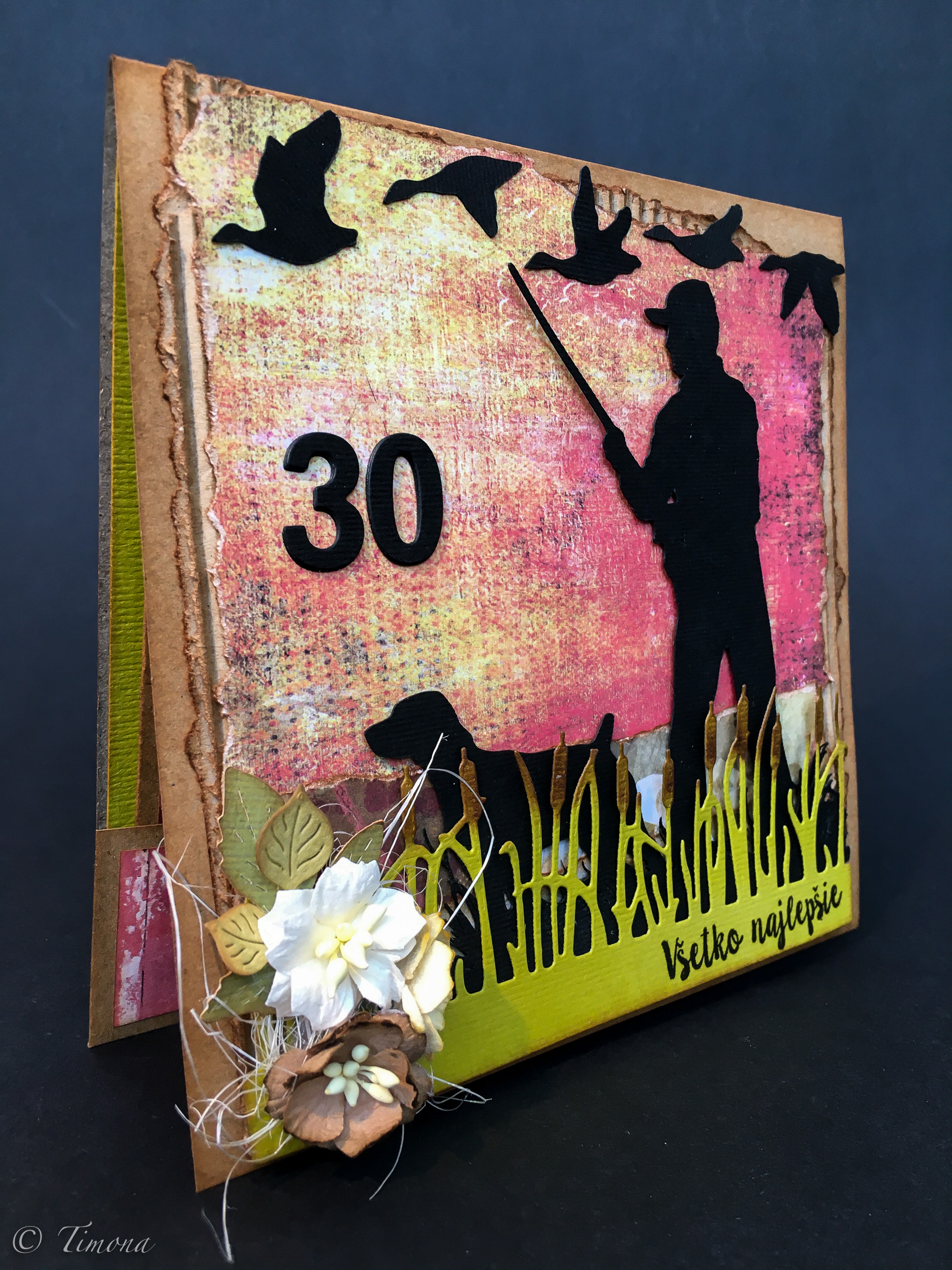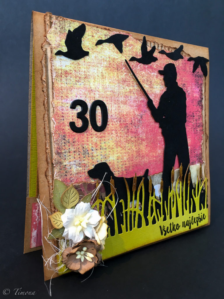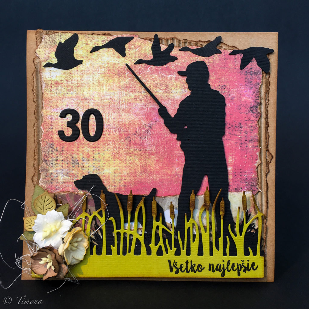 Na základ pohľadnice z kraftového papiera som navrstvila vlnitú lepenku a dizajnové papiere. Na ne som umiestnila siluety poľovníka, psa a letiacich kačíc, ktoré som vyrezala z čierneho fotokartónu na plottri. Doplnila som výrez šachoriny, presnejšie rastliny zvanej pálka, zopár kvietkov, výrezov lístočkov a sisalu. Nechýba napečiatkovaný blahoprajný text a číslo prezrádzajúce vek oslávenca.