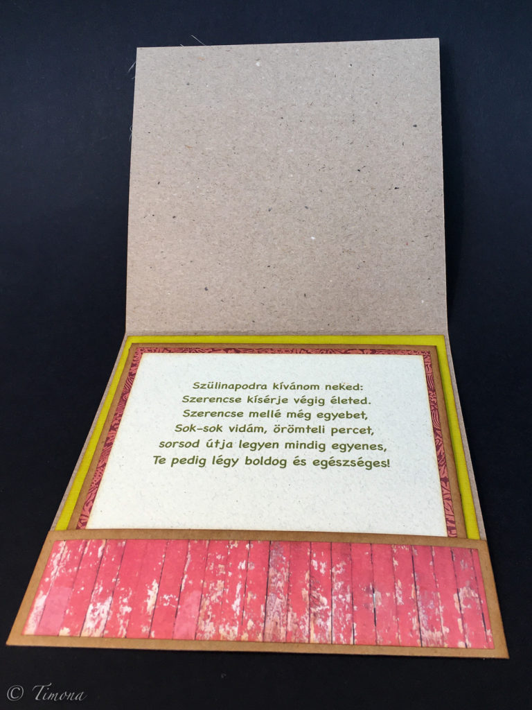 Do vnútornej časti som urobila jednoduchú kapsičku, do ktorej je vložená obálka (na narodeninový finančný príspevok, možno predplatenú kartu). Na prednej strane obálky je nalepený narodeninový vinš.