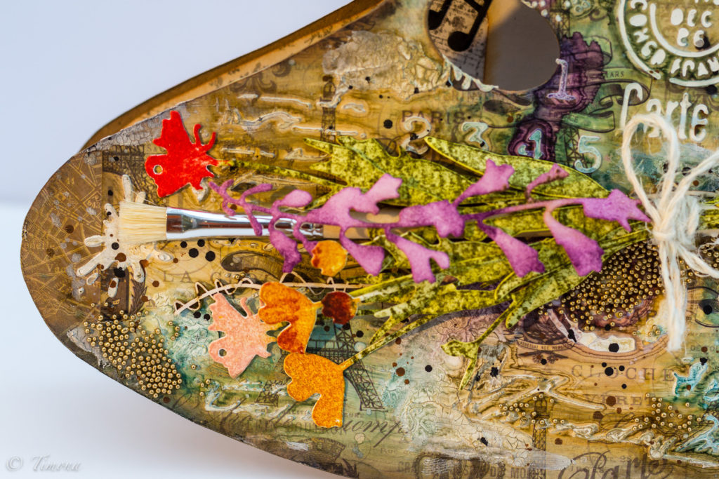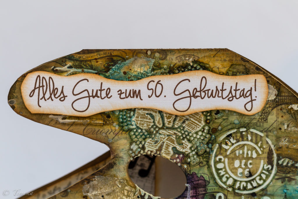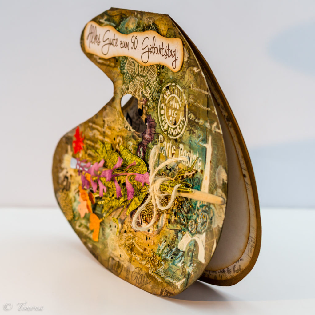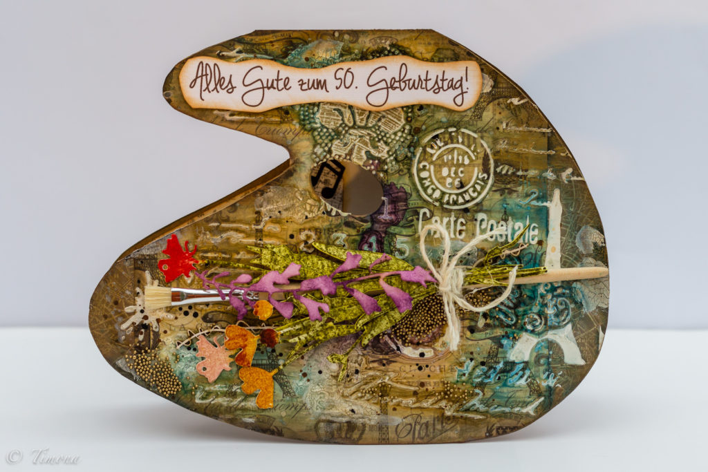 Paletu, základ karty, som si nakreslila na kraftový papier a ručne vystrihla. Nájsť vhodný dizajnový papier, ktorý by reprezentoval všetko francúzske je asi nemožné. Väčšinou je to buď o samotnom Paríži, alebo o Provence a levanduliach. Aj keď mám „na sklade“ hádam tonu krásnych dizajnových papierov, nie a nie nájsť nejaký vhodný. A keď už konečne nejaký nájdem, tak je malý…. Vyriešila som to teda použitím dvoch rozličných papierov, ktoré som nalepila na základ karty. Potom som to pretrela priehľadným gessom a po uschnutí som cez šablónu (resp. použila som dve rôzne) naniesla texturovaciu pastu. Tým vznikol na palete krásny reliéf. Farbila som ecoline farbami za výdatnej pomoci vody v rozprašovači a na prskance som použila vodovky v tube. Nakoniec som detským vlhčeným obrúskom zotrela farbu z niektorých častí reliéfu. Konečnou bodkou bolo náhodné nanesenie zlatého vosku. Bielym konopným špagátom som viazala do kytičky štetec spolu s  výrezmi Timíkových kvietkov (rozumej kvietkov od Tima Holtza), ktoré som nafarbila atramentami Distress Ink. Kyticu som na kartu prilepila matným Heavy body gelom (Pentart), ktorým som na kartu prilepila aj mikroguličky. Blahoprajný nápis som vytlačila na tlačiarni, krivolako obstrihla nožnicami, otupovala hnedým atramentom Distress Ink a podlepila samolepiacimi 3D štvorčekmi.