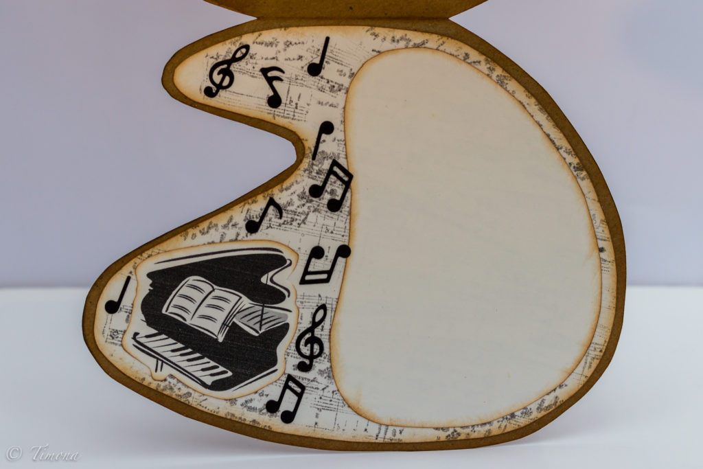 Do vnútornej časti karty som vlepila akvarelový papier, ktorý som predtým opečiatkovala motívom notového zápisu a písmom. Ešte pribudol obrázok klavíra, výrezy nôt  a kúsok prázdneho papiera pre napísanie osobného vinšu pre oslávenca.