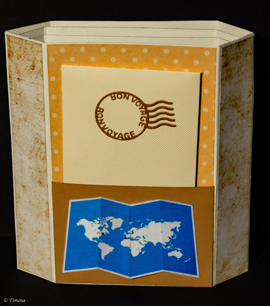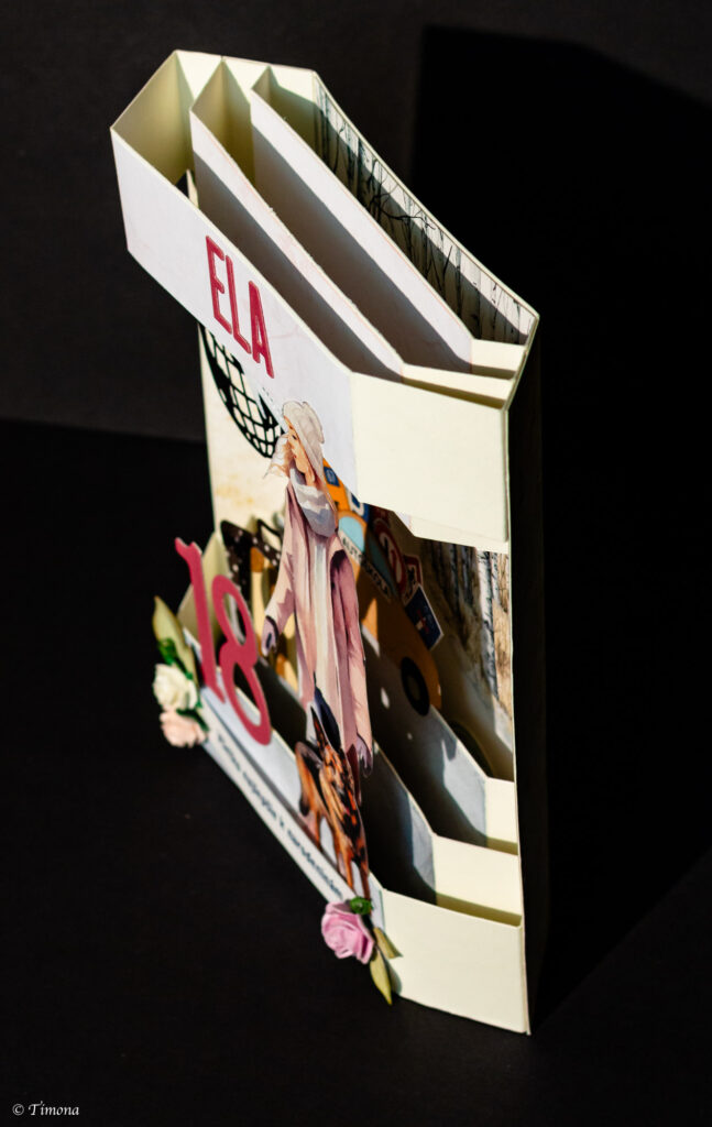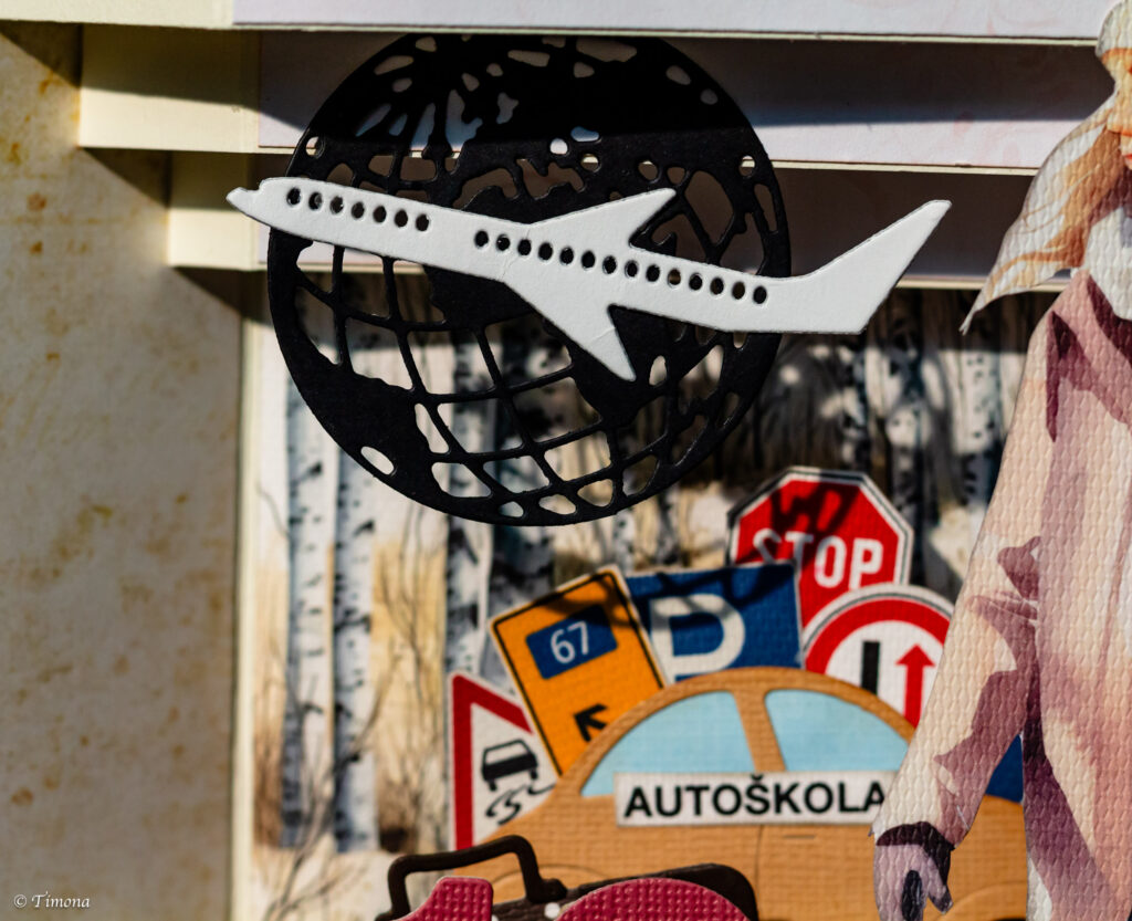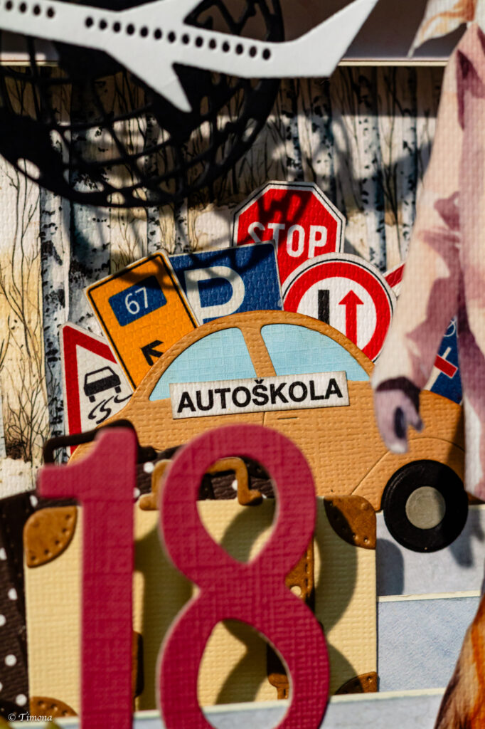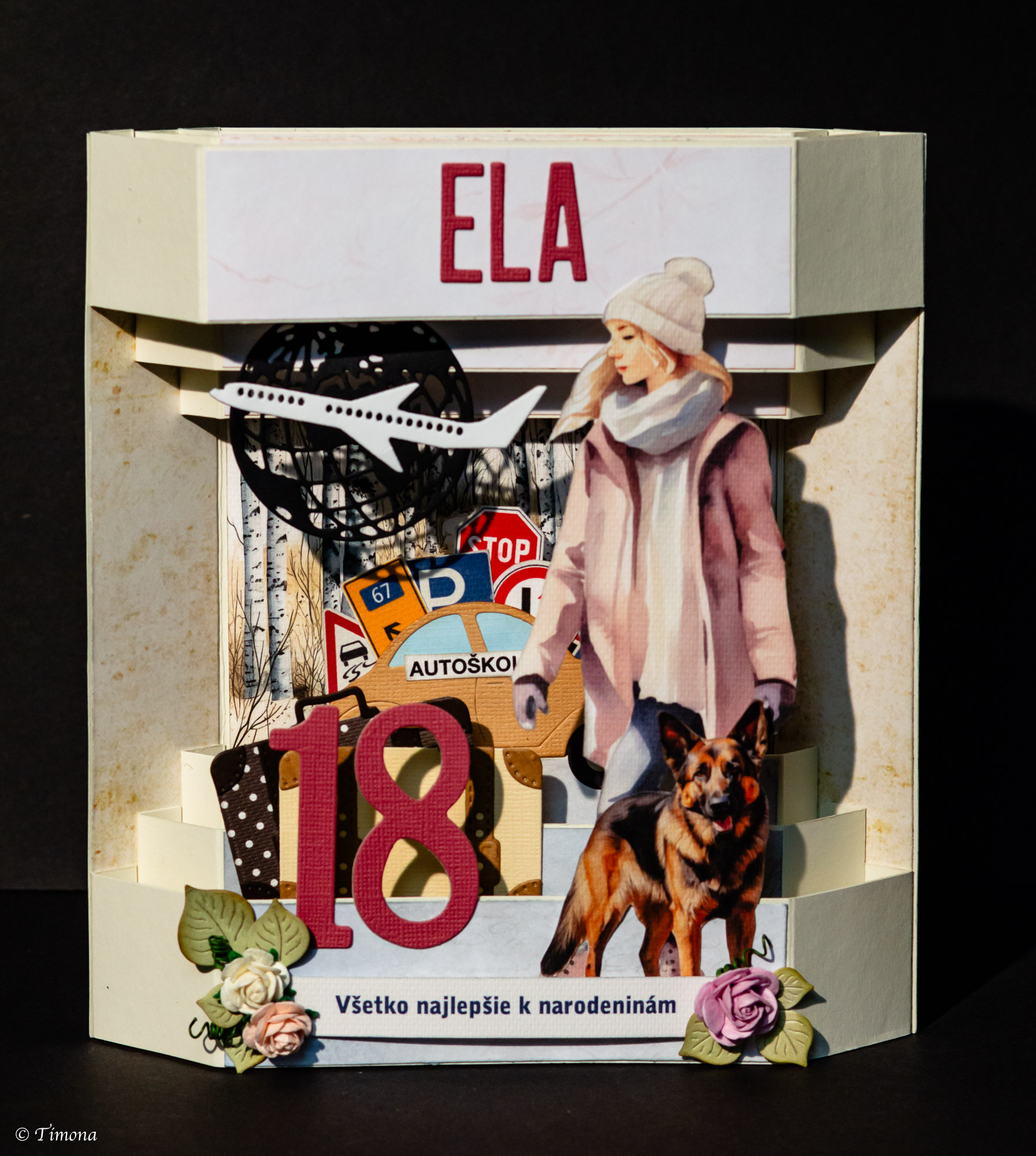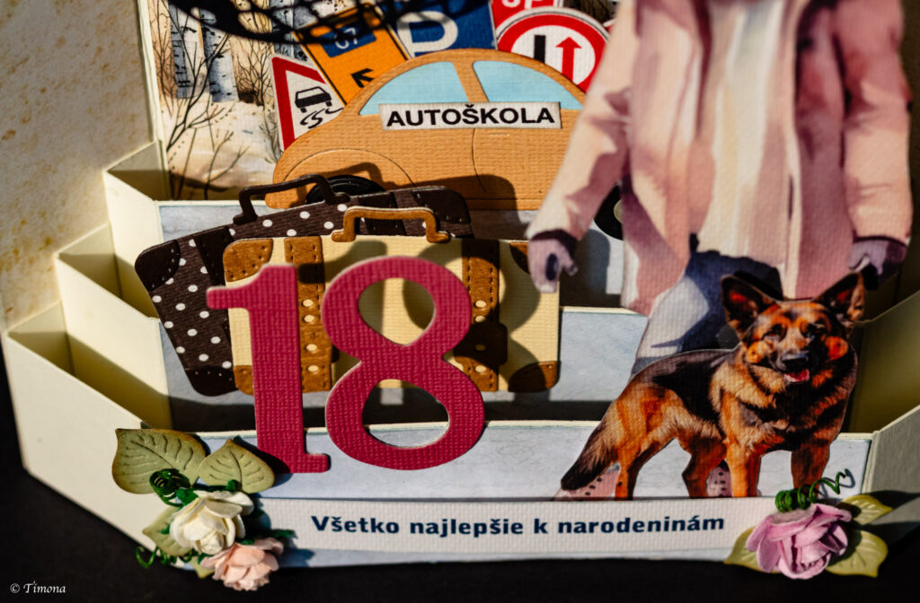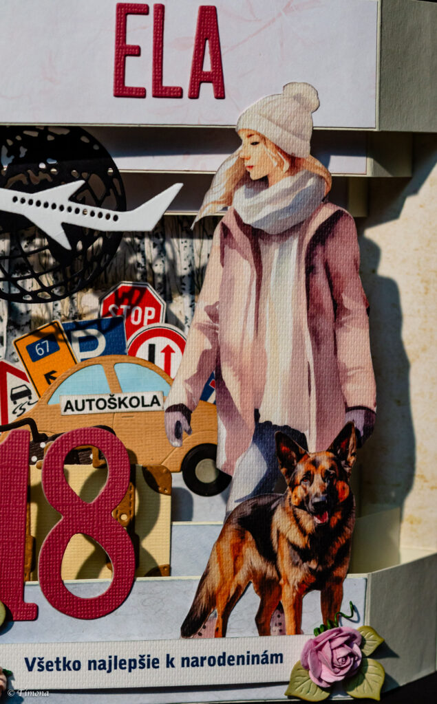 Tentoraz som vyrábala pohľadnicu ako darček k 18. narodeninám pre mladú dámu, ktorá rada chodí na prechádzky so svojím vlčiakom, rada cestuje  a aktuálne si robí vodičský preukaz.