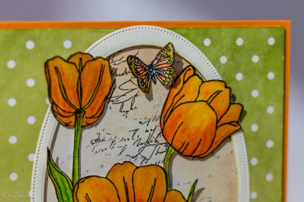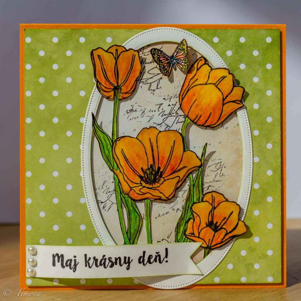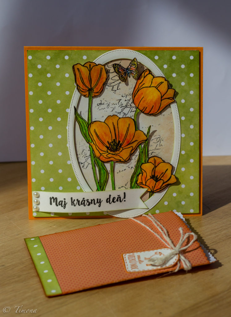 S jarnými vetrami k nám privialo ďalšiu výzvu v Pohľadnicovom klube – jarnú, veľkonočnú. Maťka ju avizovala už skôr, tak som v predstihu vyhotovila pohľadničku s jarnými tulipánmi. Pôvodným úmyslom bolo vyfarbiť pečiatku tulipánov na červeno-žlto, no nejako som to pri vyfarbovaní nedomyslela a výsledok je skôr oranžový :-). Úplne to zabil môj drahý, že „aha, vlčie maky“…. Nuž, neviem kde sa stala chyba :-))). Verím, že pohľadnička docestuje v poriadku a poteší moju jarnú pohľadnicovú „tweensku“.