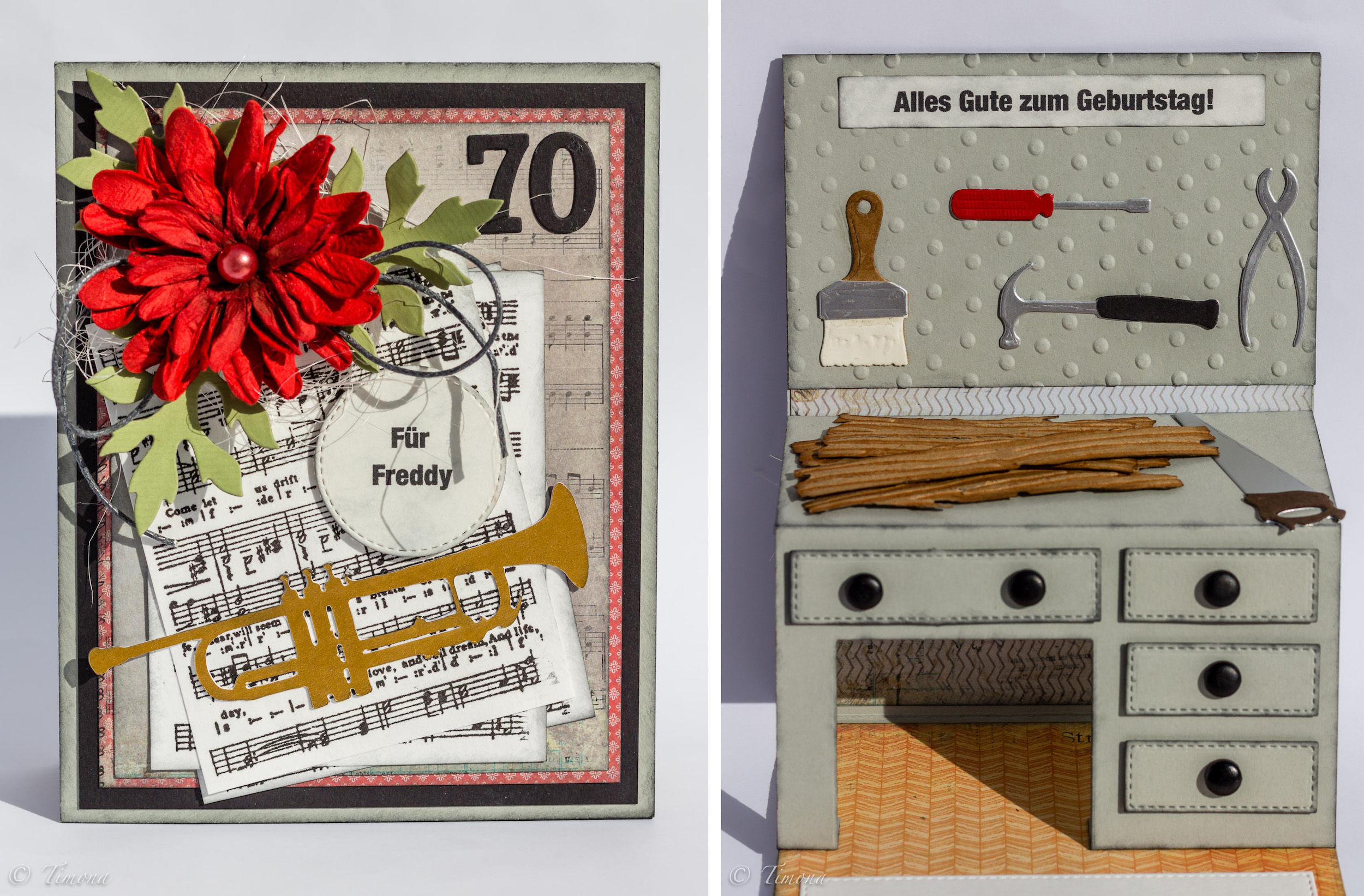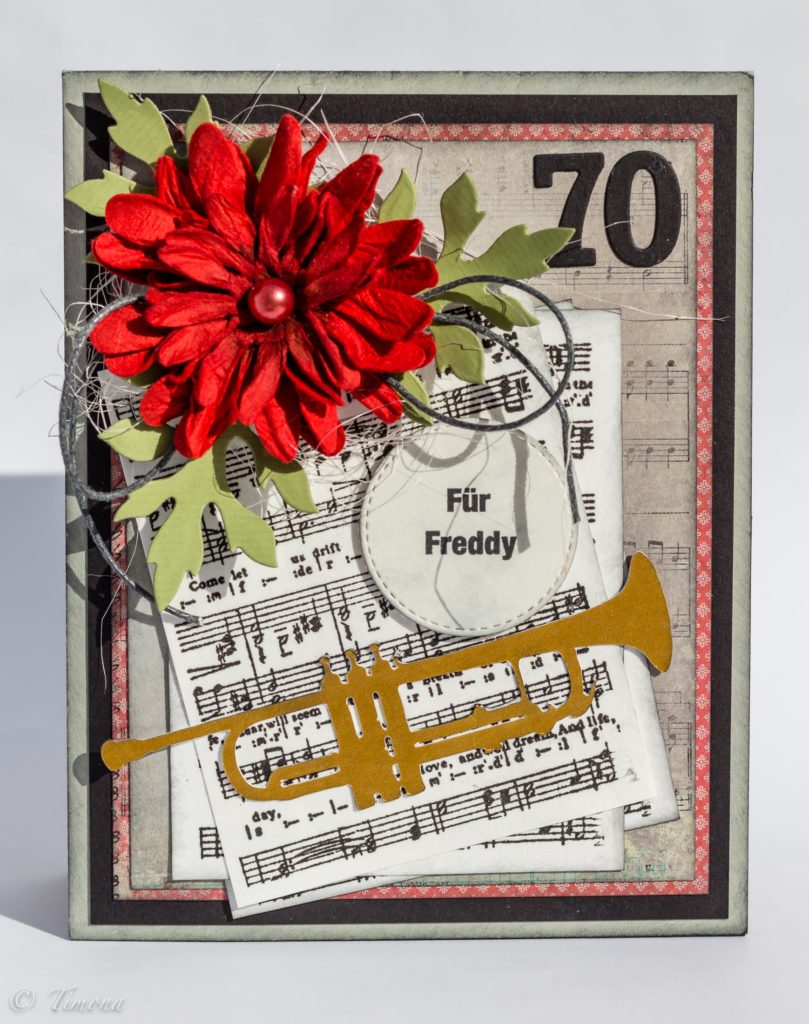 Často dostávam zadania na výrobu narodeninovej karty, kde požiadavkou je zachytiť do nej záľuby či zamestnanie oslávenca. Tentoraz to bola karta k sedemdesiatke pre pána, ktorého hobby je práca s drevom a zároveň je muzikantom v kapele, kde hrá na trúbku.