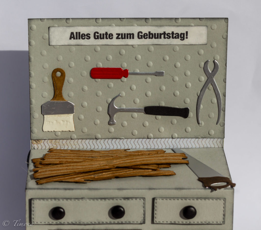 Motív stolárskej dielne som už raz robila, tak som si ho v tejto karte zopakovala – no v inom štýle a tiež farbách. Pri výrobe som použila materiál a pomôcky od organizatorka.sk.
