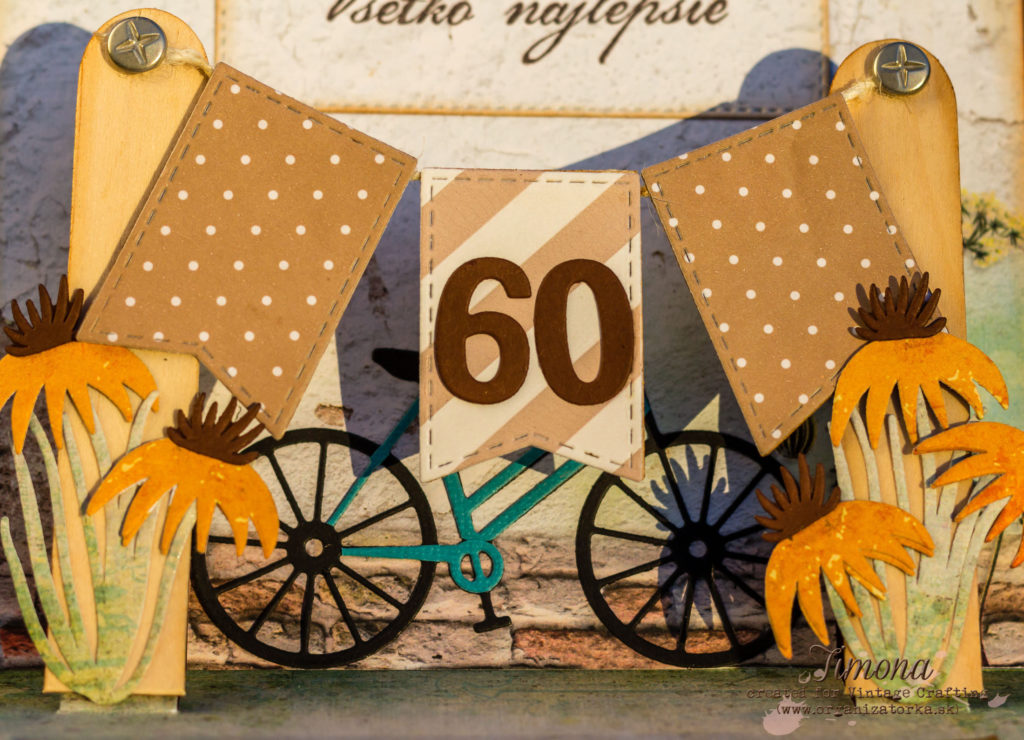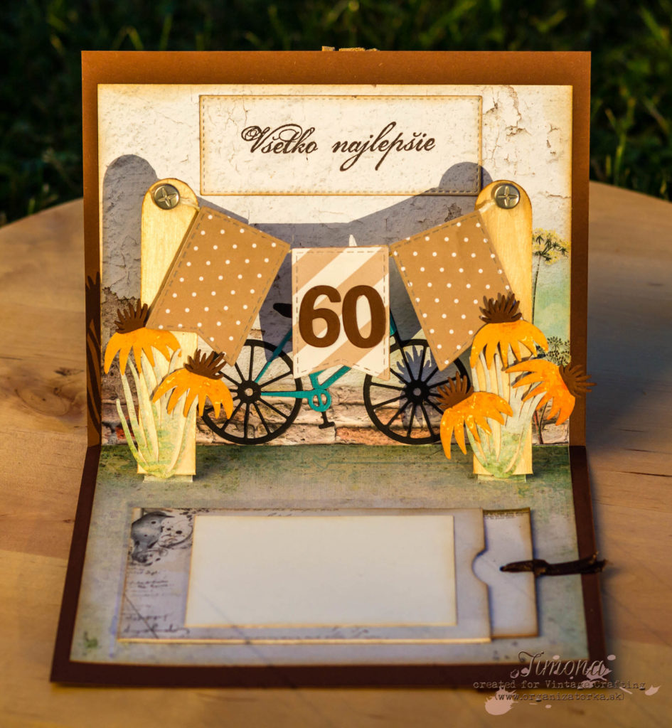 Do vnútornej časti pohľadnice som prilepila dva rôzne dizajnové papiere z tej istej sady ako aj na prednej strane a je vyzdobená stĺpikmi (skrátené lekárske paličky), do ktorých som predtým navŕtala dierky. Do nich som prevliekla šnúrku, zafixovala svorkami. Svorky som zozadu zamaskovala tak, že som ich prelepila rovnakým prúžkom hnedého papiera. Na šnúrku som prilepila „vlajkoslávu“. Sĺpiky sú prilepené tak, aby sa po otvorení pohľadnice zodvihli do priestoru (pop-up efekt). Ďalšou výzdobou sú papierové výrezy bicykla a kvietkov vyrezané vyrezávacími šablónami. Nechýba slovenský nápis Všetko najlepšie, ktorý som napečiatkovala rýchloschnúcim atramentom na akvarelový papier.