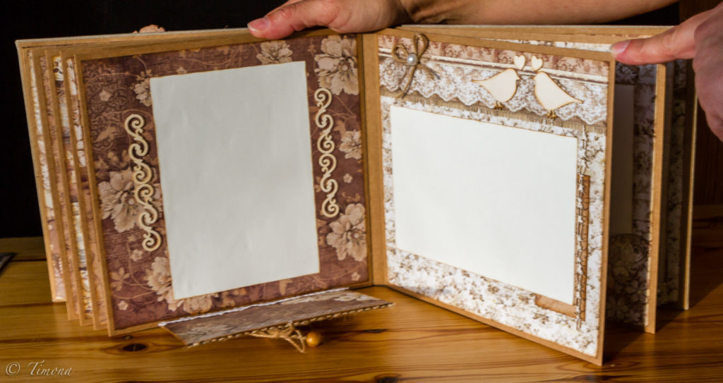 A aby prezeranie albumu nebolo nudné, bude potrebné opäť objavovať rôzne zákutia hľadaním, otváraním či odväzovaním :-). Výzdoba vychádza z motívov zobrazených na dizajnových papieroch a doplnila som ju rôznymi výstrižkami z nich, čipkami, svorkami, špagátom, samolepiacimi polperličkami a perličkami urobenými pomocou tekutých enameliek.