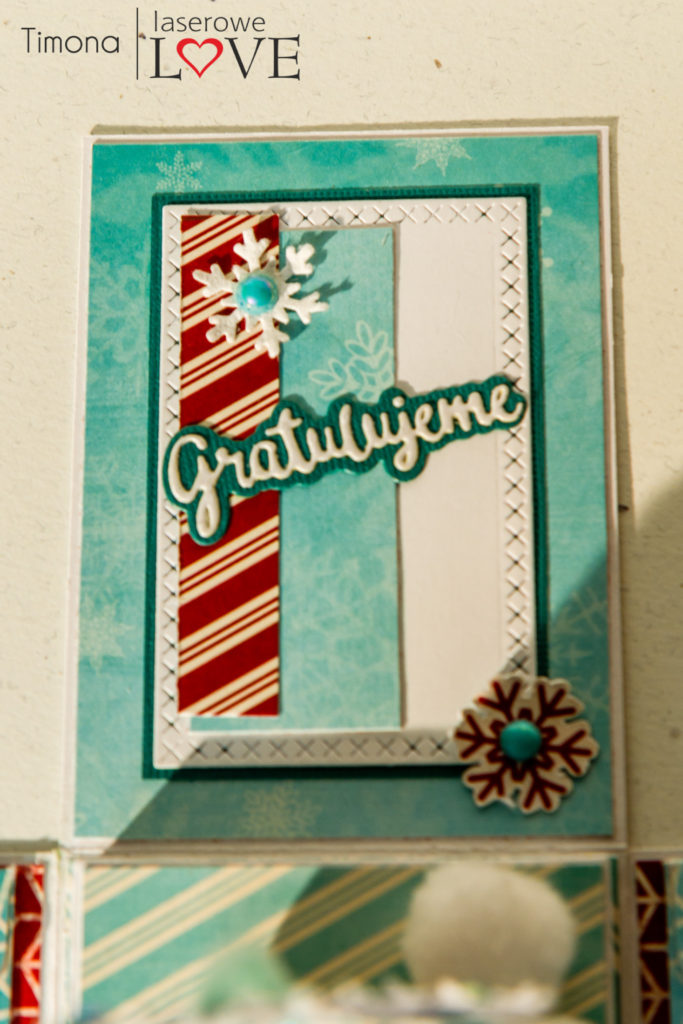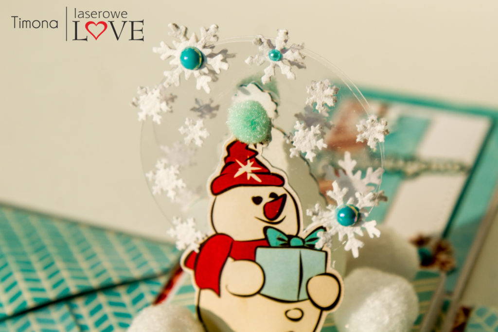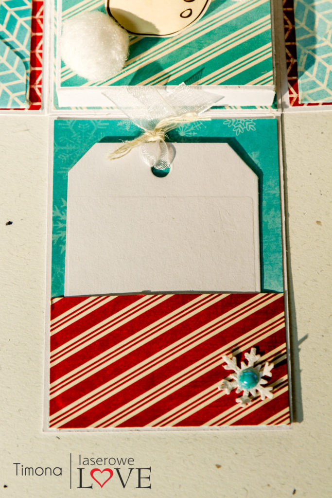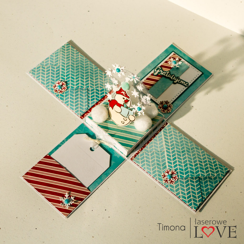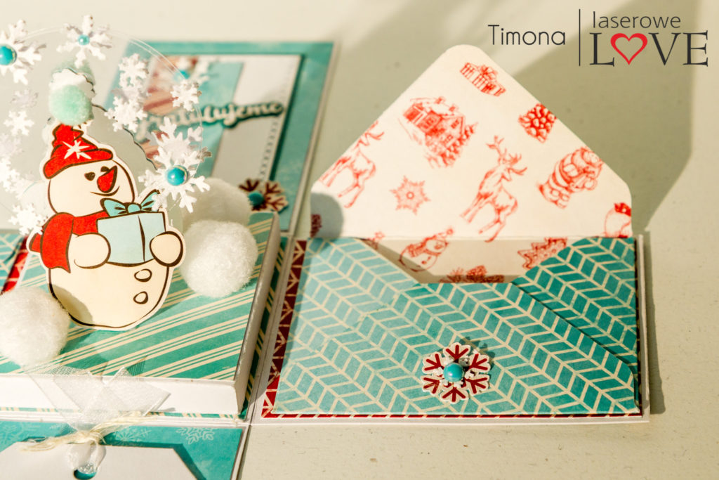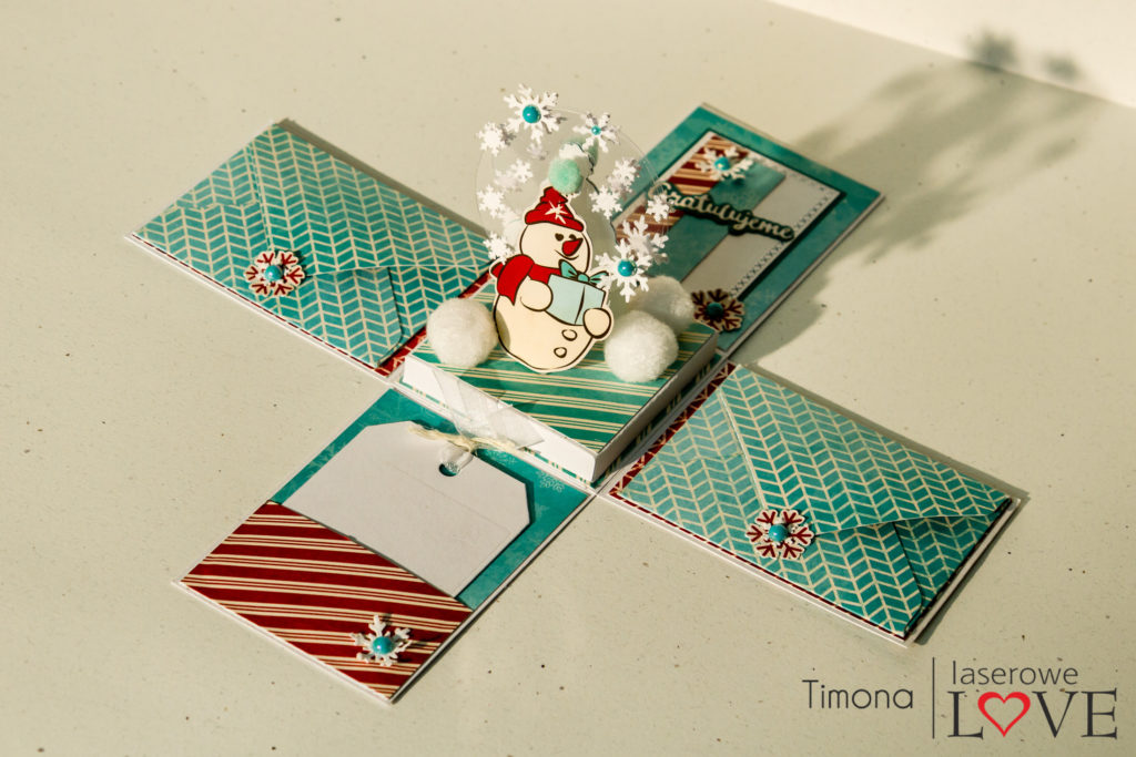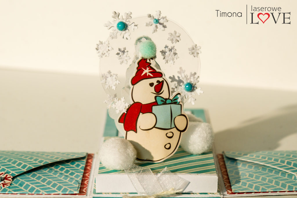 Do vnútra krabičky som umiestnila dve obáločky, do ktorých sa dá vložiť darčeková karta či finančný darček. Osobný vinš sa dá napísať na visačku, ktorú som vložila do kapsičky. Centrálnou výzdobou sú snehuliaci. Krabičku som zdobila papiermi z kolecie Winter fun od Laserowe Love.